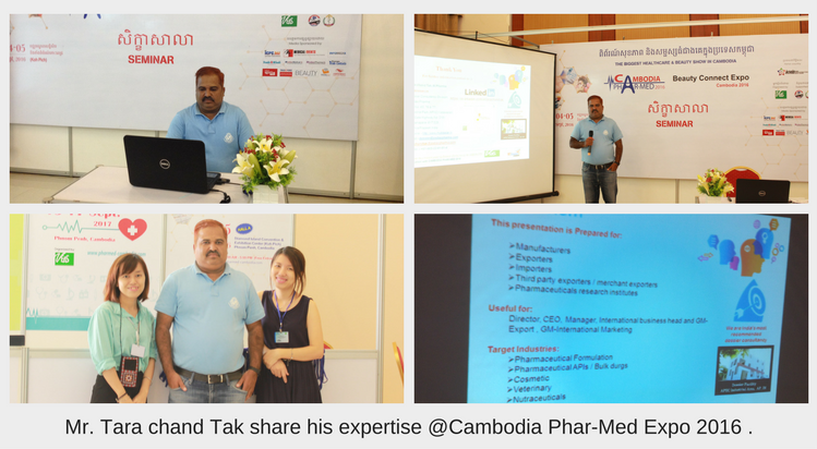 + September 2016 - Mr. Tara chand Tak visited Cambodia as Speaker (for event Pharma Med 2016, Cambodia) to share his expertise on ASEAN dossiers